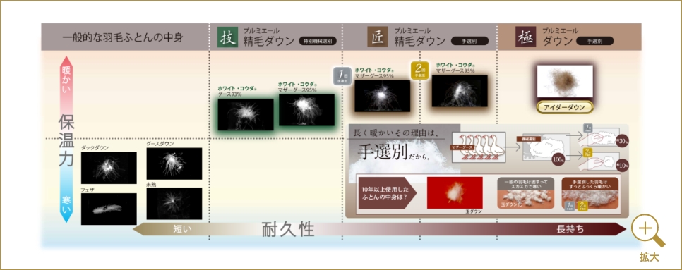 その中でも母鳥の羽毛を使ったマザーダックやマザーグースがより羽毛が大きくなり暖かくなります