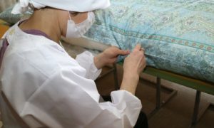 新しい生地にわたを入れた後は手作業で布団を閉じます。
