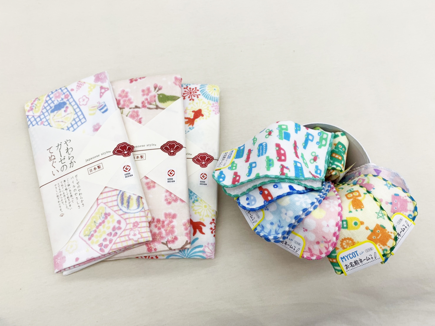 ガーゼ&裏パイルの手ぬぐい(左500円+税)とハンカチ(右350円+税)