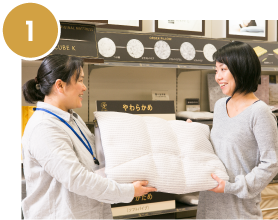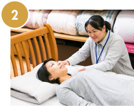 快眠マイスターが、お客様の体調(肩こり、腰痛、その他の体調)や眠りに関するお悩みをお伺いし、枕選びや寝具選びのご相談を承ります。