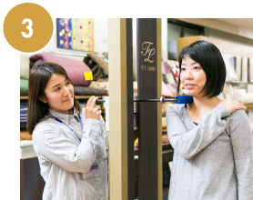 出来上がったまくらをその場で、フィッティングしていただき、寝心地を体感してください。快眠マイスターが寝姿勢をチェックしながら、微調整いたします。
